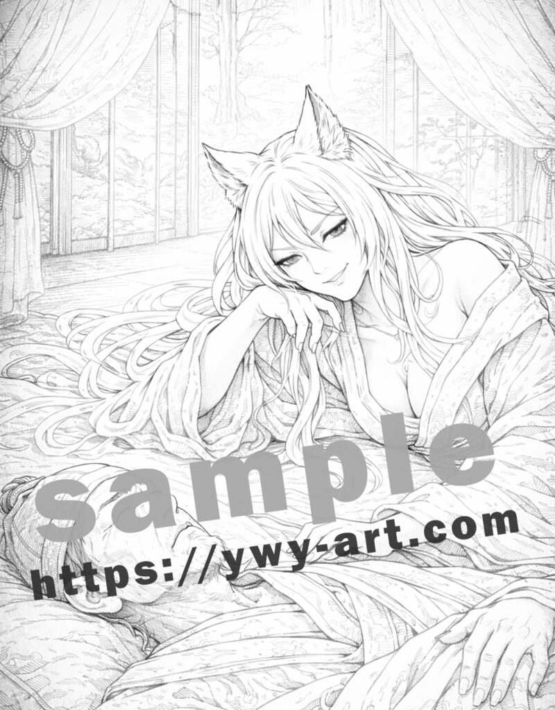 室内の装飾や衣装の重なりは、細かな塗り込みを楽しめる構成になっています。布の質感や陰影を表現することで、落ち着いた世界観の中に深みを加えることができます。