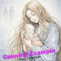 The composition balances intricate interior details with open spaces, allowing for both detailed coloring and softer shading. Draped fabrics, layered textures, and delicate expressions create a scene that invites careful observation.