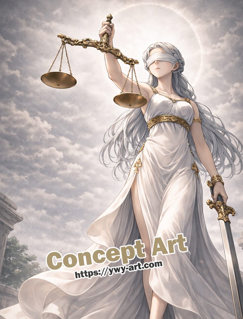 Themis should never feel aggressive. Her power is expressed through presence, not action. The lighting, posture, and composition should all reinforce this idea.