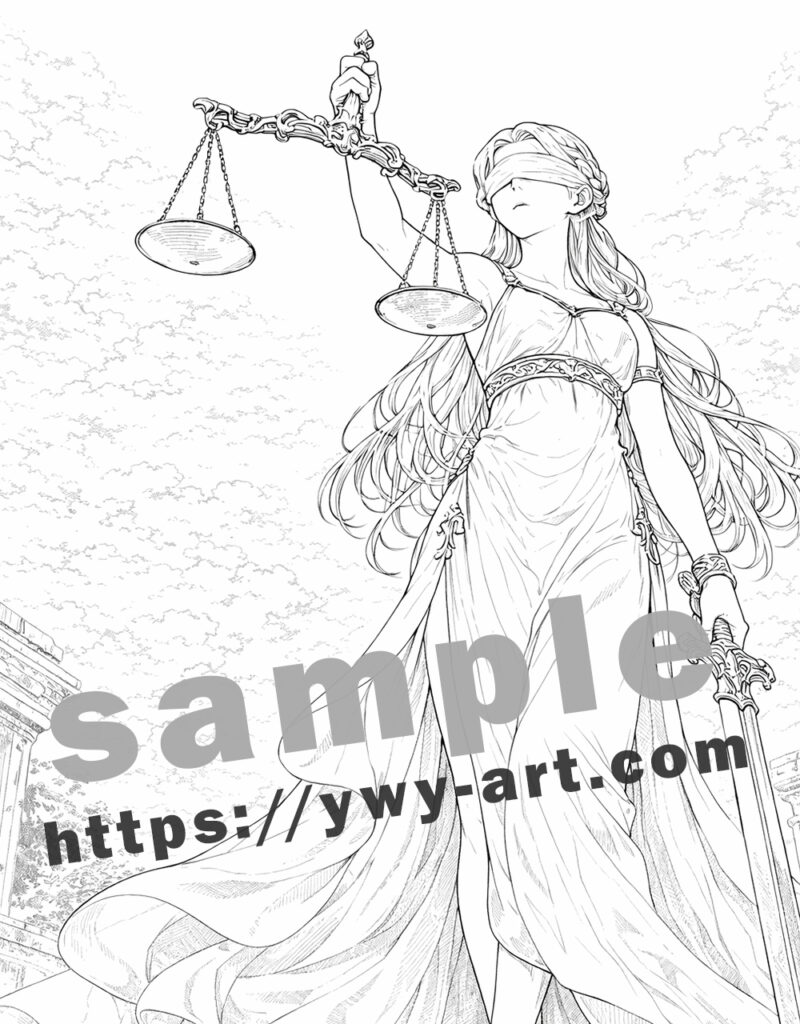 静止した人物と激しいエネルギーの対比により、内と外の緊張を表現しています。テミスの冷静さが、周囲の混沌をより強調する構図になっています。