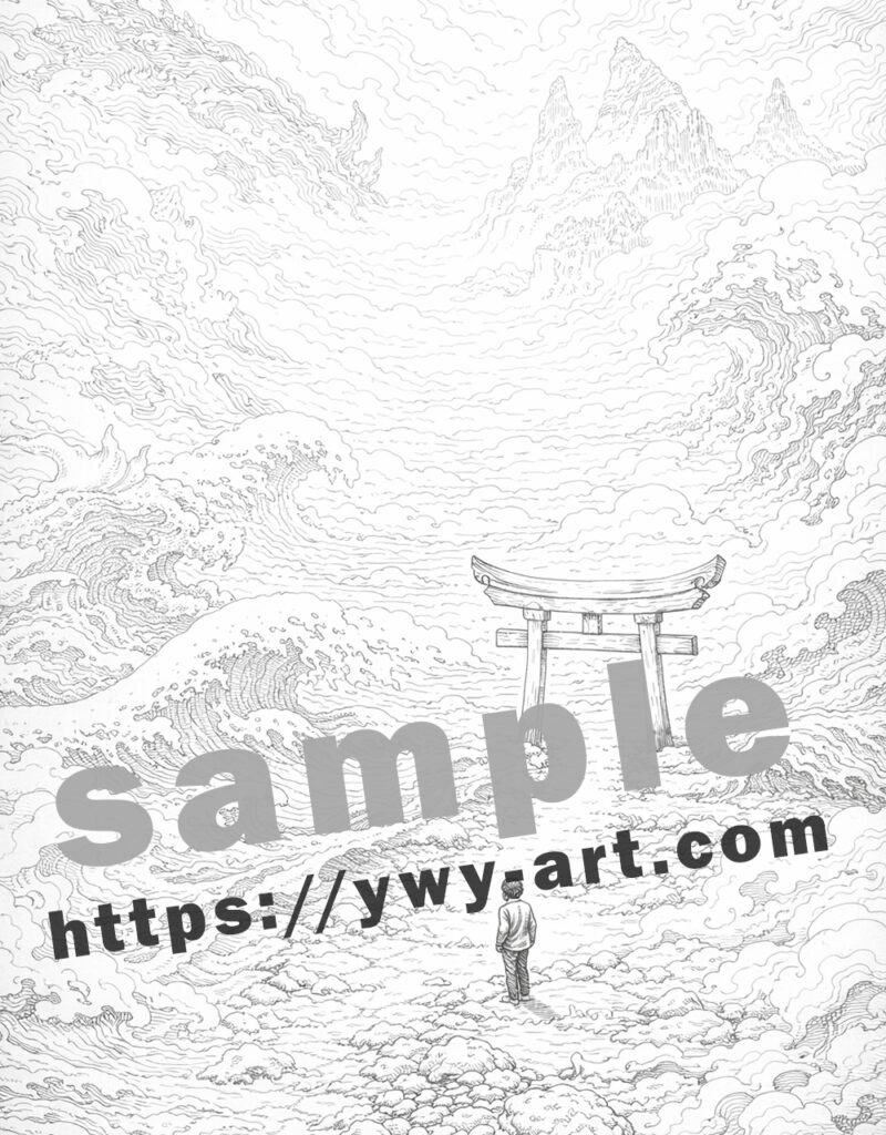 The surrounding waves and clouds can be colored in flowing gradients or subtle contrasts, allowing the artist to explore movement without losing clarity. The torii gate may be highlighted with stronger tones, creating a focal point within the shifting world.