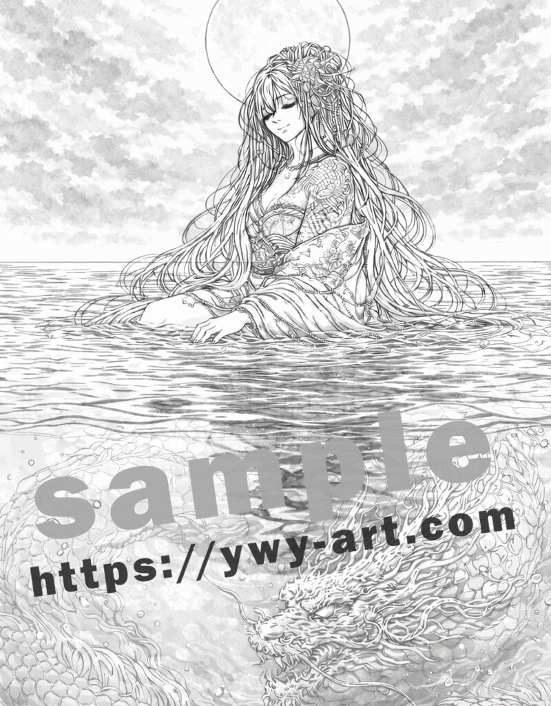 流れる髪、水面の波紋、そして水の下を進む龍の姿が、幻想的で奥行きのある構図を作り出しています。