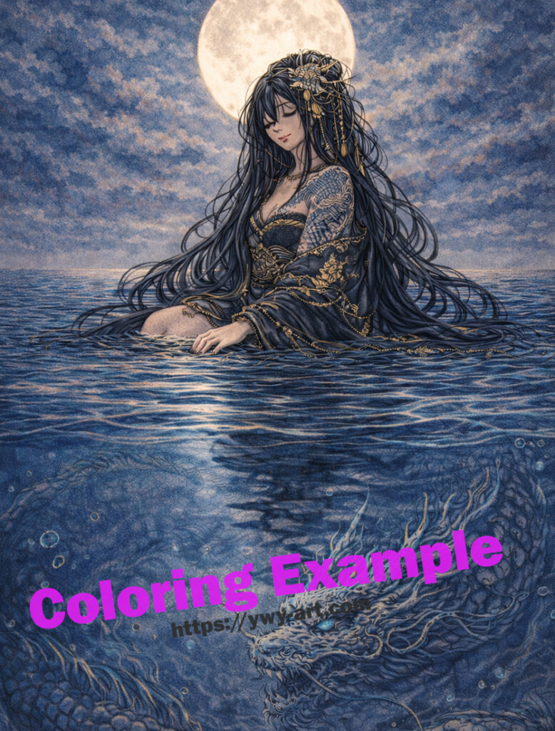 The contrast between the quiet surface and the powerful presence below creates a sense of mystery. Toyotama-hime appears calm and composed, yet the dragon beneath the water reminds us that she belongs to a world far beyond human understanding.