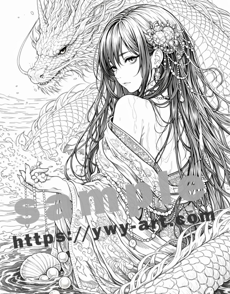 このイラストでは、豊玉姫は海の波の中から現れ、その背後には彼女の血筋を象徴する白い龍が姿を現しています。真珠や貝、静かな波紋が海の神秘と静かな力を表現しています。