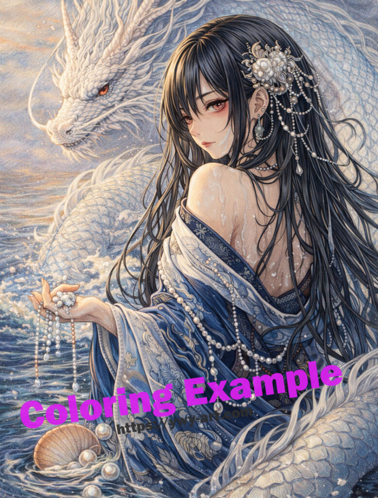 In this illustration, Toyotama-hime emerges from the flowing ocean accompanied by a majestic white dragon, symbolizing her divine lineage. Pearls, shells, and gentle waves surround her, representing the hidden beauty and ancient power of the sea.