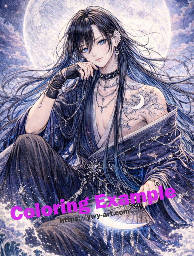 Flowing hair, silver ornaments, and crescent moon motifs emphasize the divine connection between the god and the night sky. The surrounding ocean waves reflect the influence of the moon over tides, while the calm posture of the deity represents quiet authority and watchful serenity.