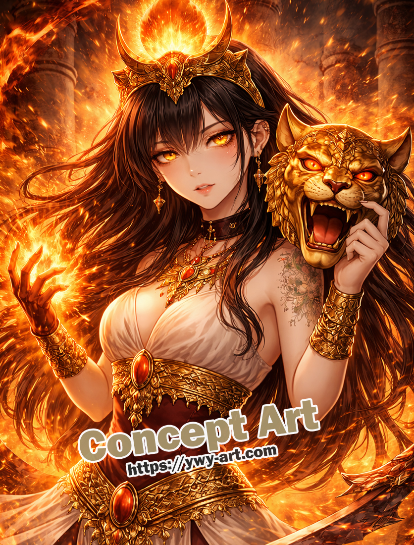 For the skin and clothing, reduce saturation slightly compared with the flames. This contrast naturally draws the eye toward the gathered energy and reinforces Sekhmet’s role as the center of destructive power.