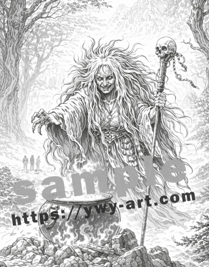 At the center of the composition, a large pot burns with an intense flame, suggesting a ritual or a sinister purpose. The rising steam and fire add a sense of movement and tension, drawing the viewer into the scene. The skull-topped staff in her hand reinforces her connection to death and the supernatural.