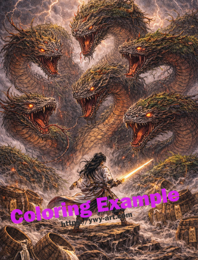 In this illustration, the moment just before the decisive battle is captured. The enormous serpent rises above the storm-filled sky, its many heads roaring with terrifying power. Below it stands Susanoo, alone yet fearless, holding his sword as lightning flashes across the heavens.