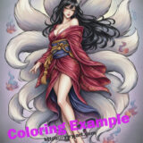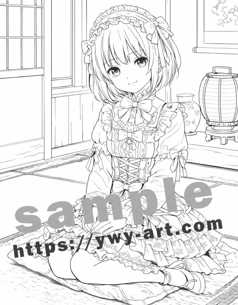 塗り絵としては、衣装や装飾の細かなディテールと、 落ち着いた構図による余白のバランスを重視しています。 レースやリボンの質感を活かした繊細な彩色から、 やわらかなトーンの表現まで幅広く楽しめます。